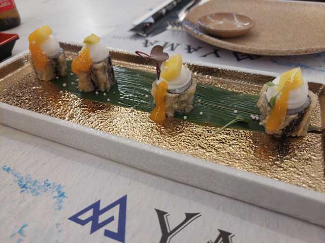 - Rollo frito con gambas queso crema, pasta kataifi y salsa teriyaki