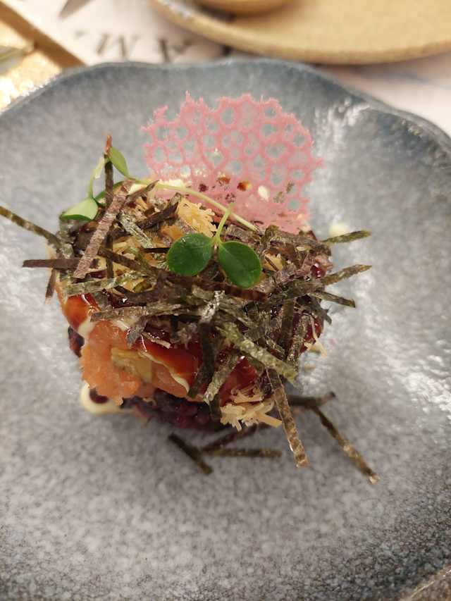- Tartar de salmon y arroz venus, cubierto con aguacae, pasta kataifi y salsa de mango