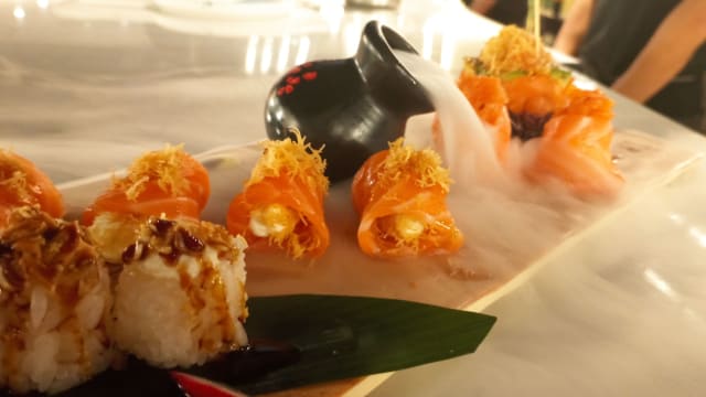 Nigiris de salmon flameado con queso crema y pasta kataifi
