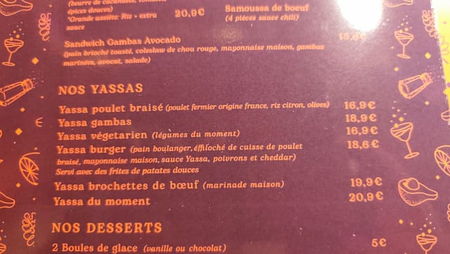 If you plan to eat at Yassa Bar, the average price should be around €18. The average price is calculated based on appetizer/entrée or entrée/dessert, excluding drinks. Prices have been provided by the restaurant.