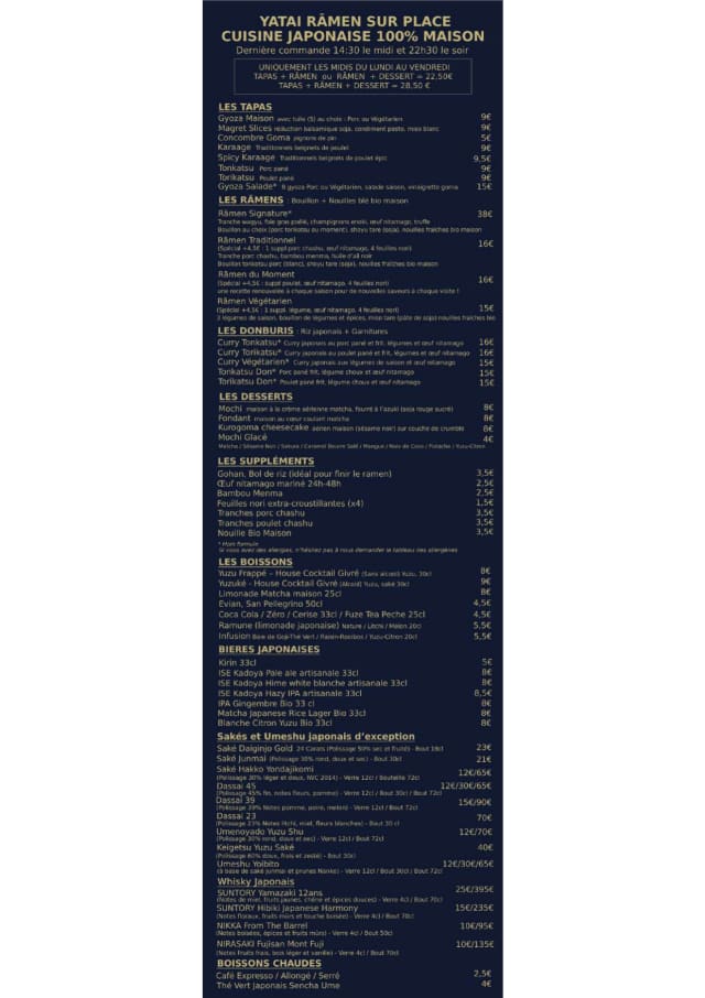 Thank you so much Joana for your wonderful review and your 9.5/10 rating! 🌟🙏🏼 We're thrilled that you loved the food, the place, and the service at Yatai Ramen Montparnasse — it truly means a lot to us! Thank you also for your kind and constructive feedback about the music. We completely understand your point and will consider adjusting both the volume and the style to offer a more balanced atmosphere, possibly integrating some traditional Japanese music to enrich the experience. We look forward to welcoming you again soon for another delicious moment of homemade Japanese cuisine in the heart of Paris! 🍜🇯🇵 See you soon at Yatai Ramen Montparnasse!