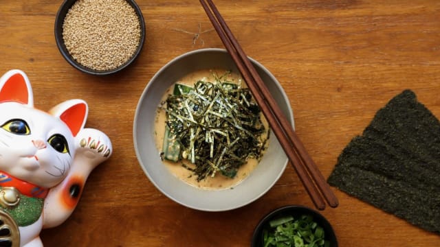 (Spécial +4,5€ : 1 suppl. Légume, ½ œuf nitamago, 4 feuilles nori) 3 légumes de saison, ½ œuf nitamago, cebette, sésame. Bouillon de légumes et épices, miso tare (pâte de soja), nouilles fraîches bio maison