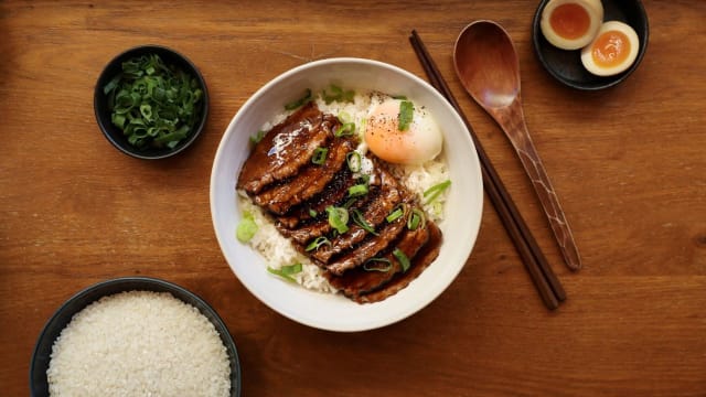 Plat japonais composé de riz japonais, daikon mariné – au choix : porc ou poulet ou végétarien