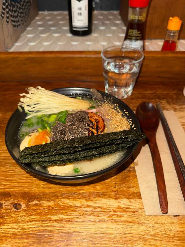 - Tranche porc chashu, bambou menma, huile d’ail noir Bouillon tonkotsu porc (blanc), shoyu tare (soja), nouilles fraîches bio maison