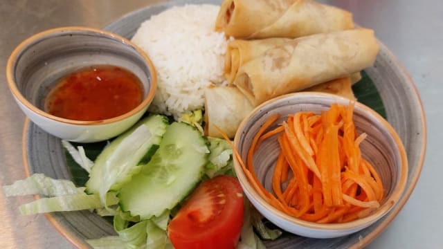 Vetenudlar, friterade och fyllda med tunna glasnudlar, asiatiska grönsaker, koriander och thai kryddor. Serveras med jasminris, liten sallad och sötsur sås.