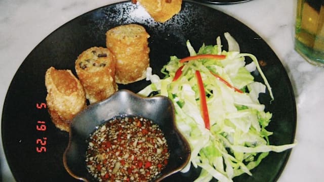 Rice noodles, vegan or chicken spring rolls, lemongrass, fish sauce, and pickled vegetables