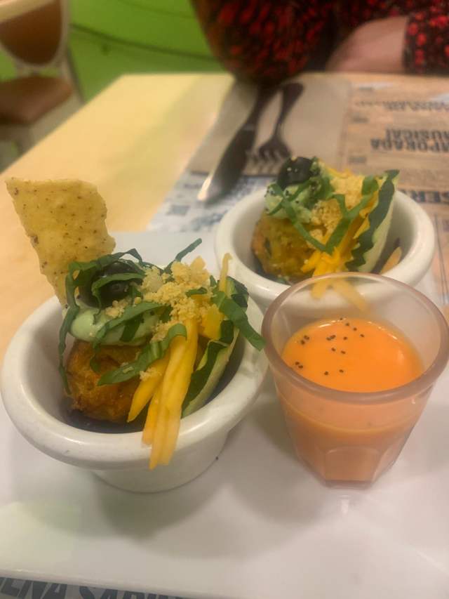 7.5/10You get a little bite with your drinks and the food are creative variants of known dishes. The atmosphere was not super cosy but it was also not bad at all.