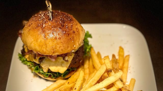 Buns artigianale, 1 patty da 150 gr di bavarese, insalata, pomodoro, cipolla croccante, bacon, cheedar, salsa tasty, patatine fritte in accompagnamento, bibita, caffè e coperto