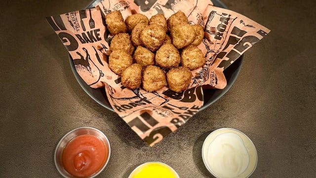 Buns artigianale, spalla e coppa di maiale cotta in bbq, coleslow, chedar, patatine fritte in accompagnamento, bibita, caffè e coperto