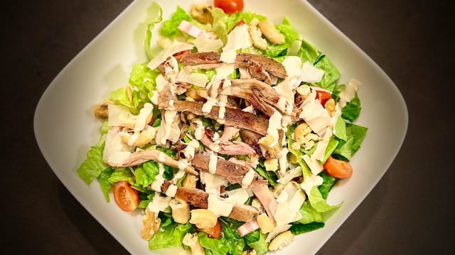 Lattuga, petto di pollo grigliato, bacon, graniglia di tarallo, scaglie di grana, noci, salsa caesar, bibita, caffè e coperto
