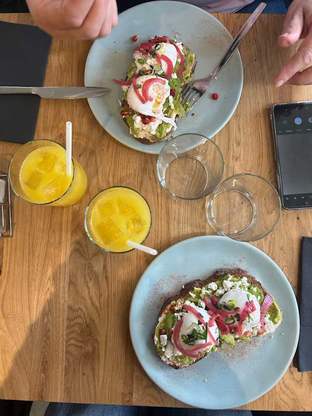 - Tartine de pain de campagne artisanal, fromage frais, avocat, œuf poché, fêta, grenade, pickles d'oignon, servi avec de la salade. Généreux, frais, efficace