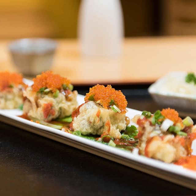 Croquetas japonesas de pulpo con copos de bonito seco, mayonesa y salsa teriyaki