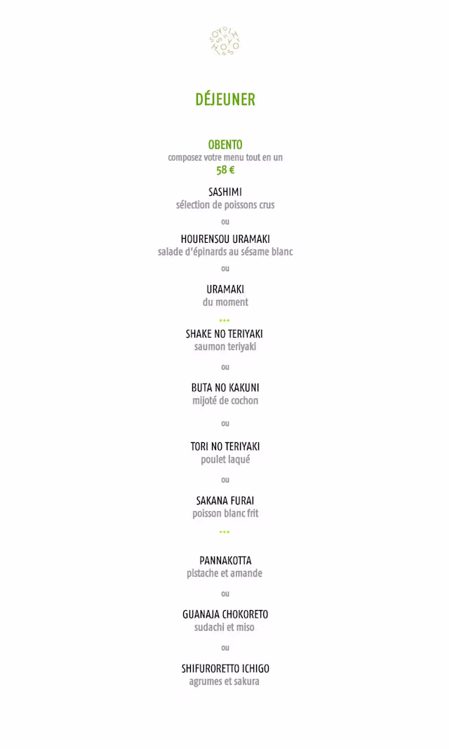 The lunch MENU is more than OK. The price is a bit 'too high' with other 1 star M restaurants in MONACO with a better Lunch MENU price wise. Quality wise the FOOD is outstanding and when the Chef is present .... the restaurant transforms! It becomes in my opinion probably one of the BEST JAPANESE restaurants I have ever been! I will come back soon! Thank you!