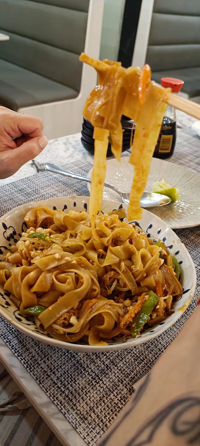 Tallarines de arroz, huevo, langostinos, verdura, doufu, cacahuetes, lima y salsa tamarindo