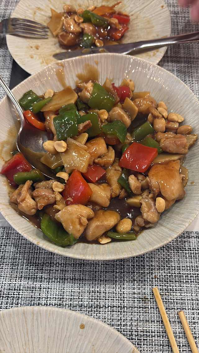 - (Pollo salteado, verdura, cacahuete y picante suave)