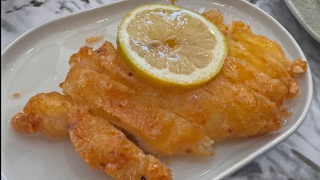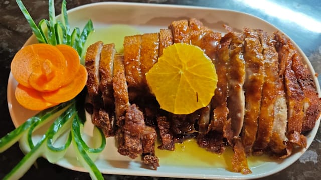 Pato asado, puerro, pepino, salsa marisco y crepes