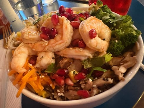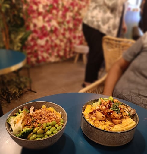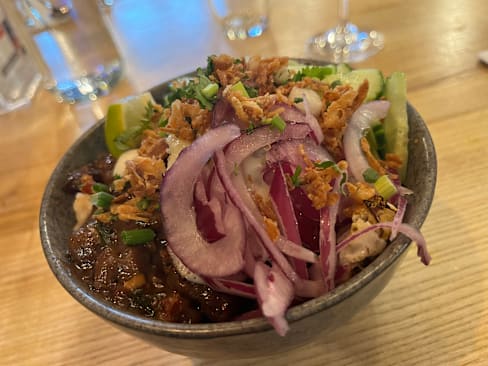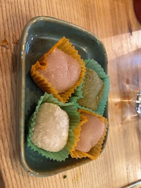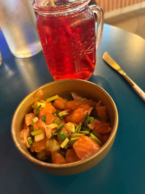9/10Salmon tartare starter. Poke bowl with brown noodles. Mochi including matcha, red bean and peanut. Hibiscus tea drink.