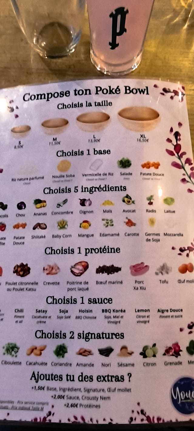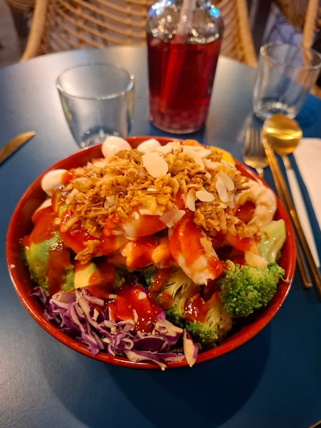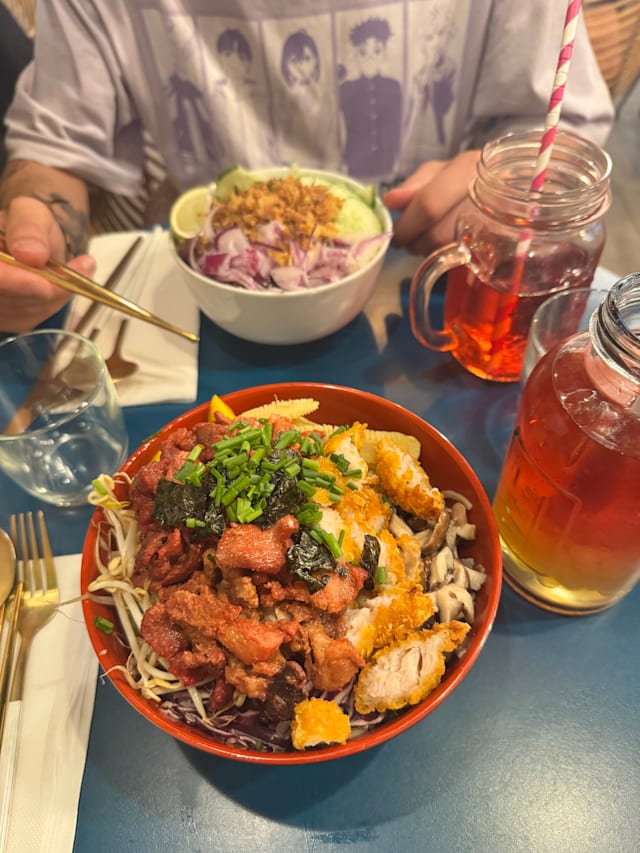 9/10Salmon tartare starter. Poke bowl with brown noodles. Mochi including matcha, red bean and peanut. Hibiscus tea drink.