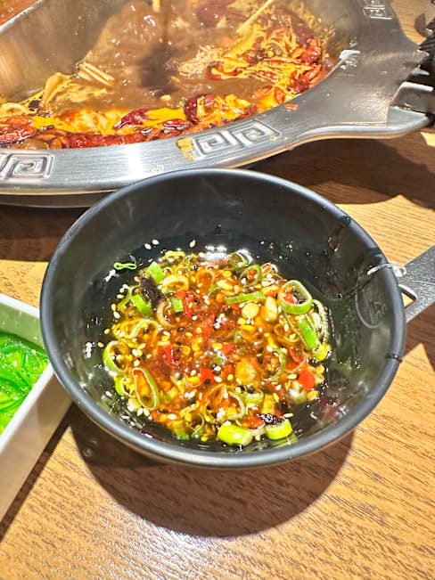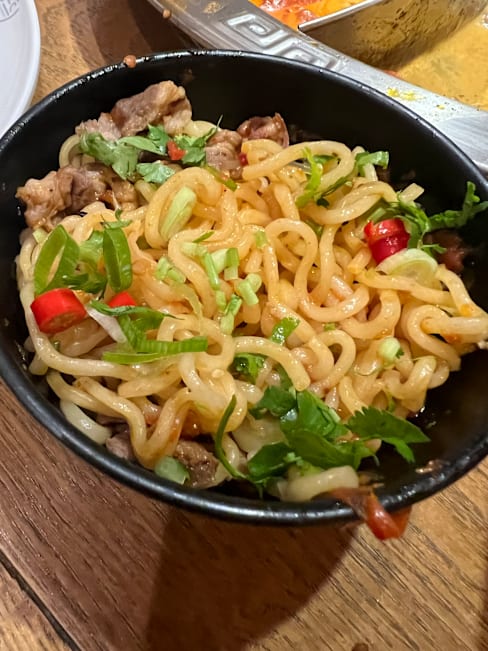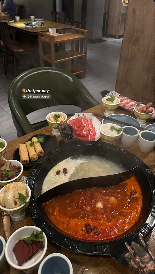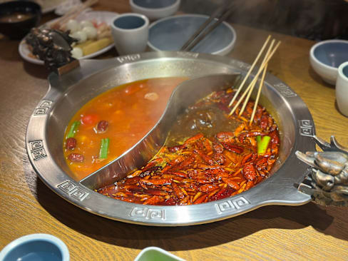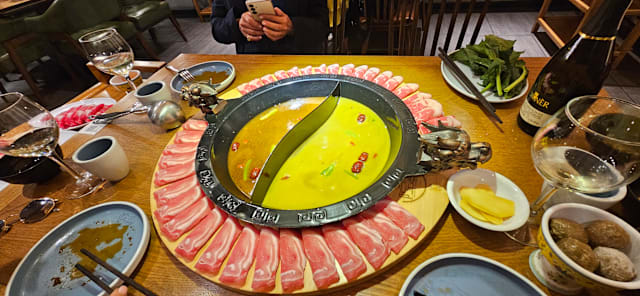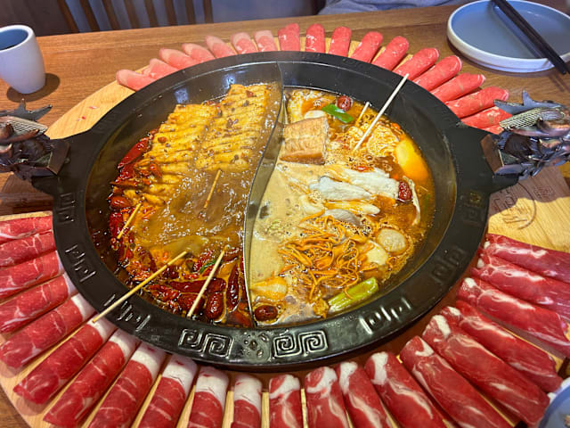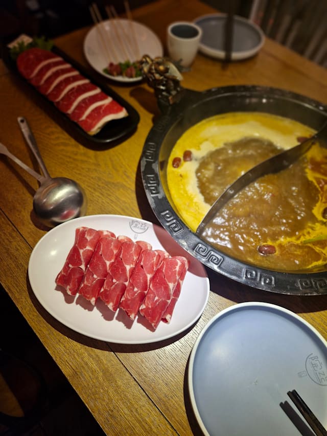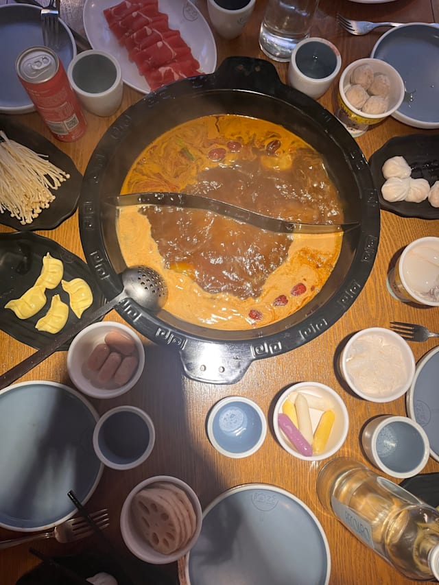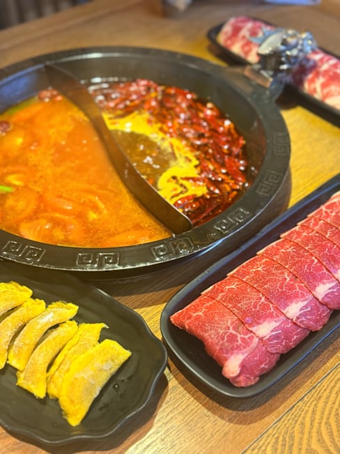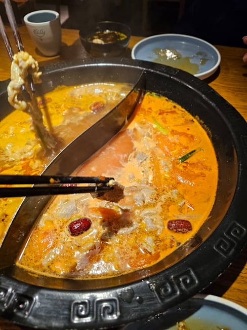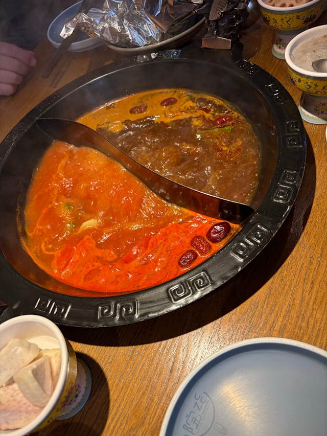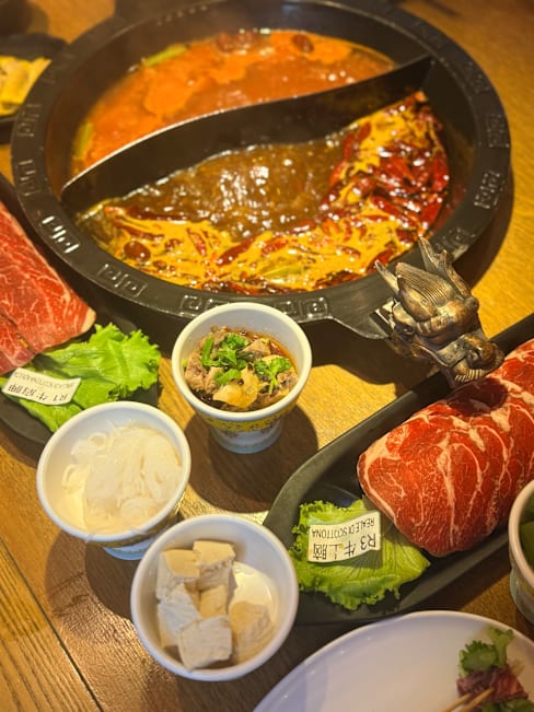 6/10The hotpot’s broth is good, dont pick the spicy one if you are not familiar with spicy food. Its way too spicy. You will have to order components separately (broth, meat, veggies, tofus, mushrooms...), quite disappointed as 1 portion of cabbage is like 5 small leaves. Easy parking, cozy atmosphere but noisy..