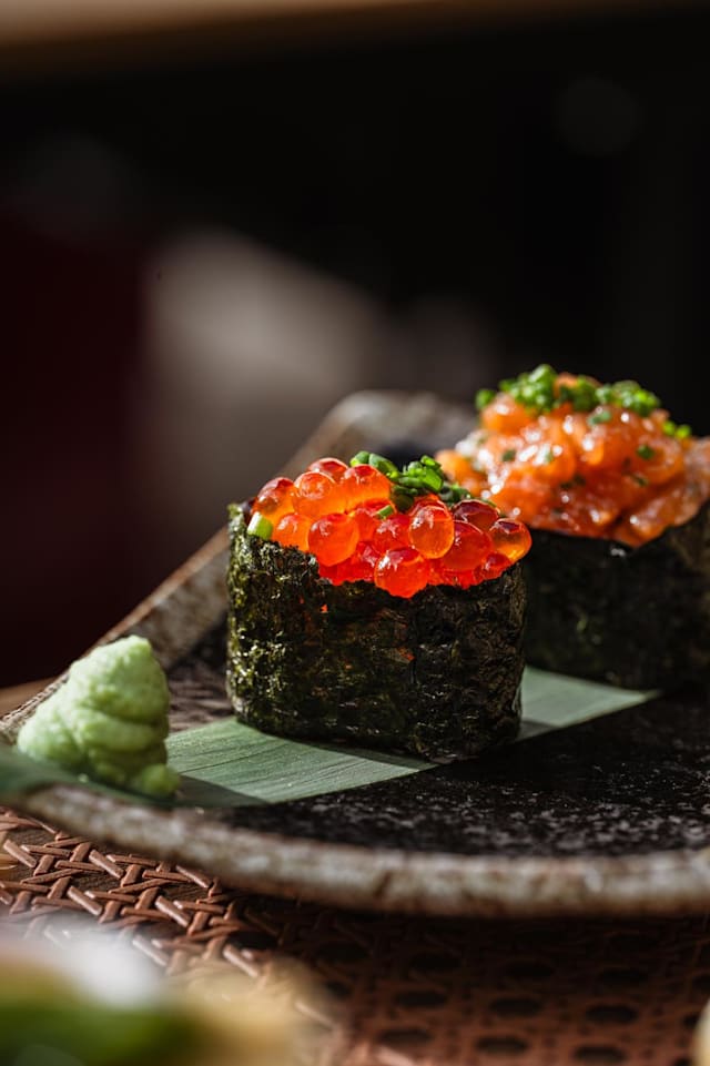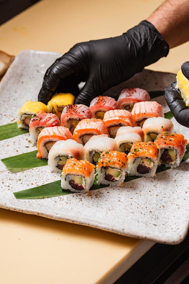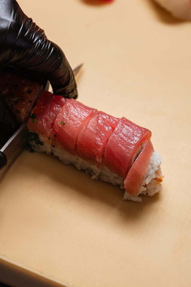 4 pièces de chaque signature, 2 nigiri thon 2 nigiri saumon, 8 maki thon, 8 maki saumon