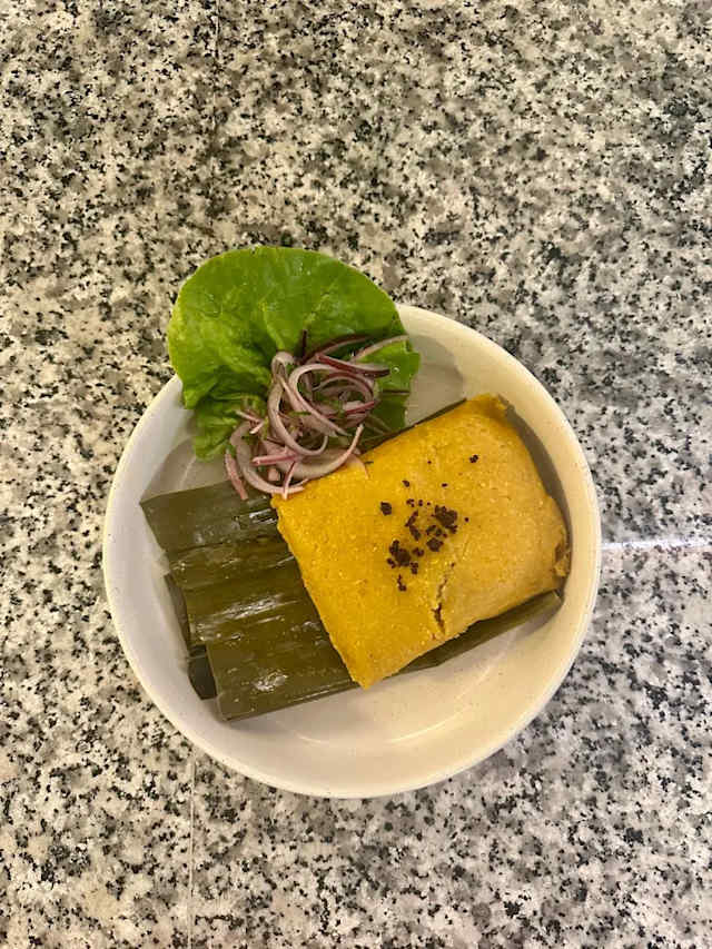 - Harina de maíz rellena de panceta de aceituna, huevo y panceta de cerdo