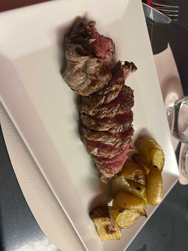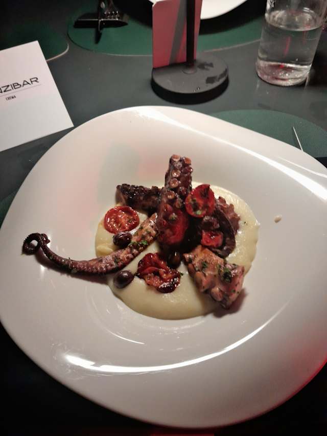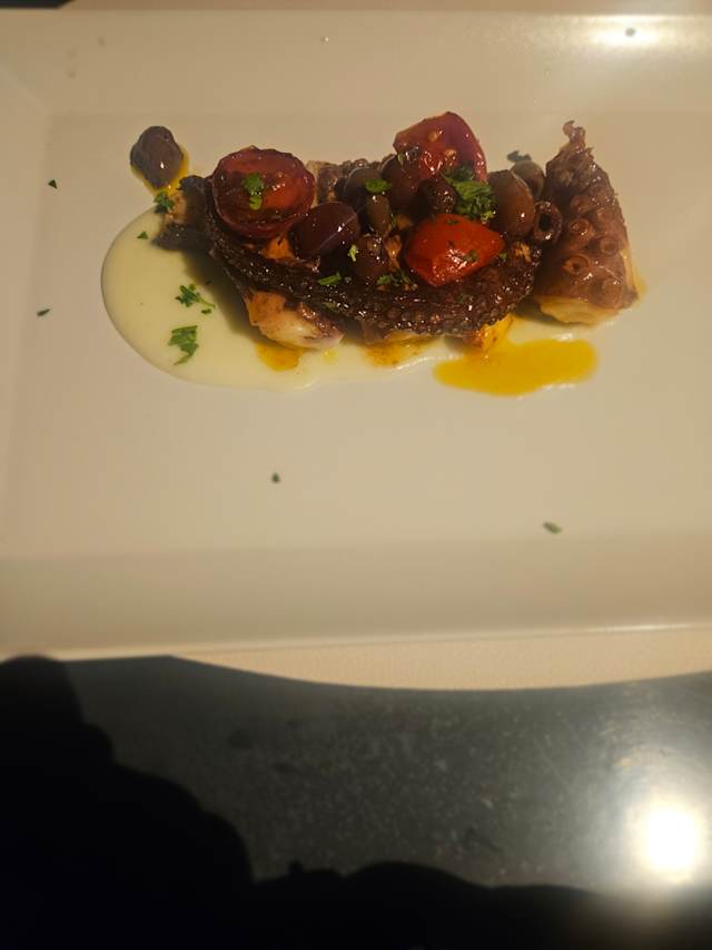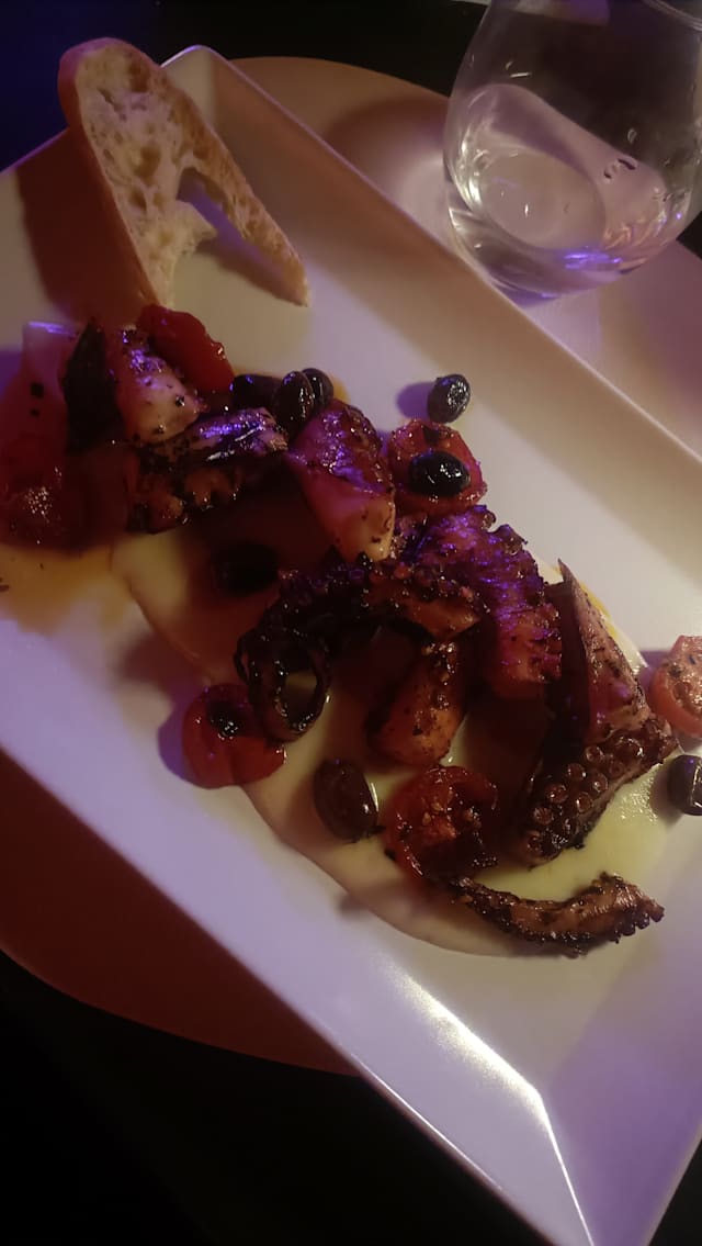 - Polpo cotto a bassa temperatura, pachino, olive leccino, purea di patate