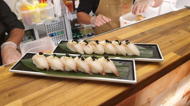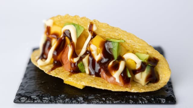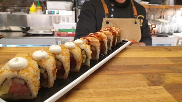 Hosomaki in tempura with tuna tartare and teriyaki sauce.