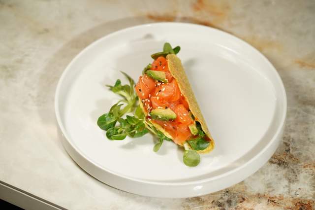 - Gamberi in tempura, insalata, salmone scottato, mayo giapponese e teriyaki (4pz)