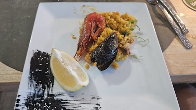 (minimum 2 servings, reservation recommended – ask for availability). Seafood paella with prawns, scallops and seafood mix. price per person.
