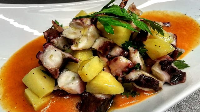 Polpo alla luciana in casseruola con olive taggiasche e pane friabile