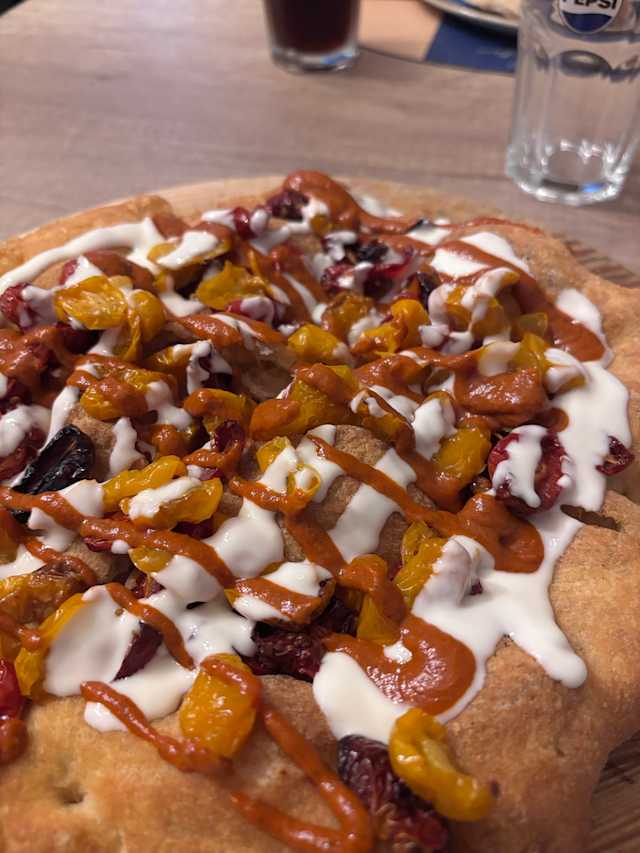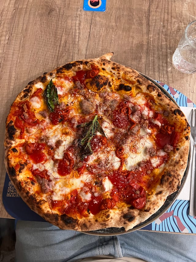 Base fior di latte salsiccia di castelpoto e pomodorino tondino , all uscita crema di nduja , marmellata di pomodoro ,pecorino ,fili di peperoncino