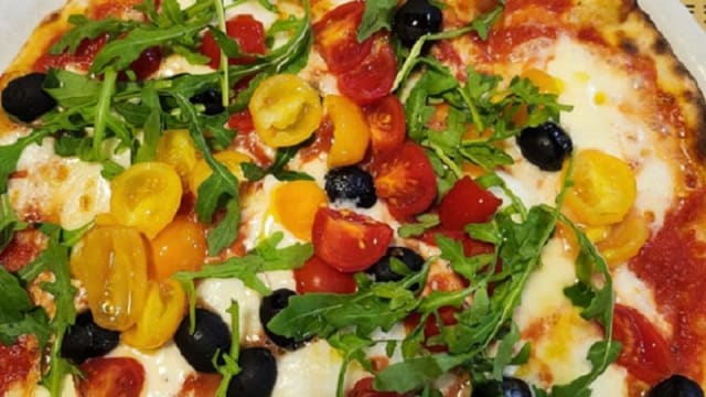 Pomodoro san marzano, fior di latte, cipolla rossa di tropea appassita in padella, tonno, olive taggiasche, dopo cottura pomodorini gialli di pachino, peperoncino, basilico fresco
