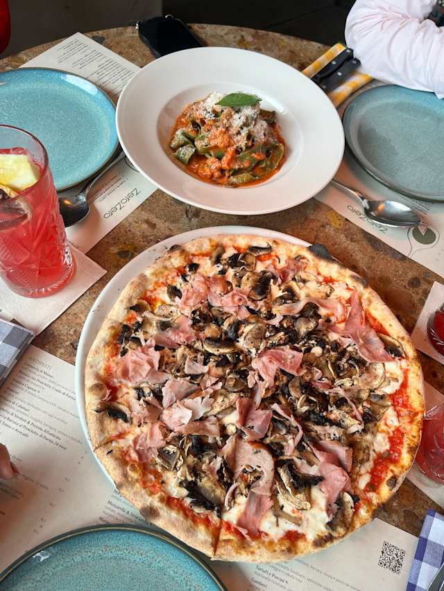 - Tomate, mozzarella fiordilatte, ragù, ventricina calabrese picante e azeitonas taggiasche