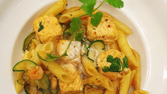 Saumon, crevettes, pâtes, coriandre, crème, courgettes, épices douces et citron.