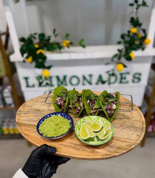 - Cuatro tortillas de espinacas rellenas de ternera o pollo, con cebollay cilantro fresco. Servidos con un untado de aguacate, lima y pimiento rojo picanteе