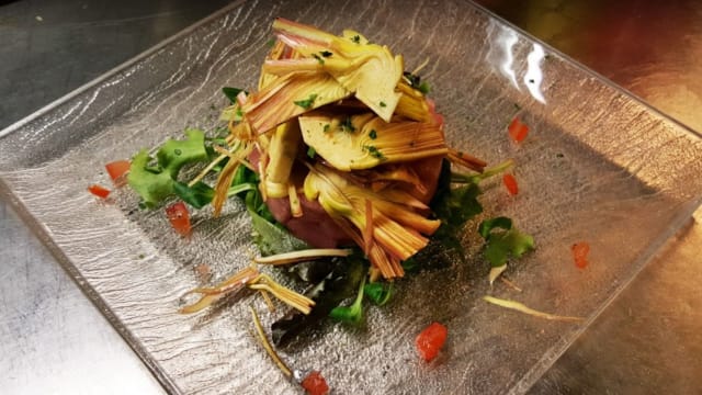 - Alla ligure su cialda di panissa gratinata e gocce di pesto DOP
