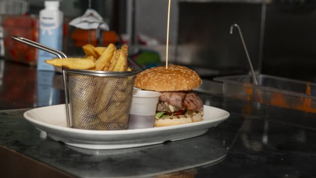 Bacon cheese burger, bbq sauce, caramelized onions with fries