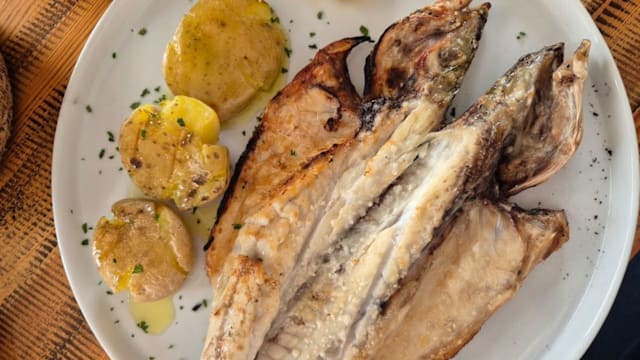 Bife de espadarte grelhado c/ batata nova ao alho e legumes