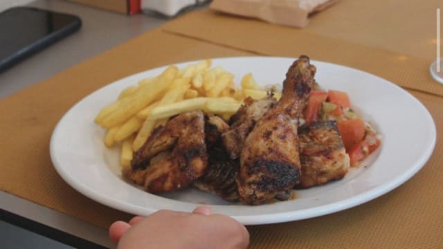 Frango grelhado c/ batata frita e salada de tomate e cebola