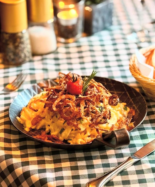 - Käse rahmsoße | röstzwiebeln | schnittlauch