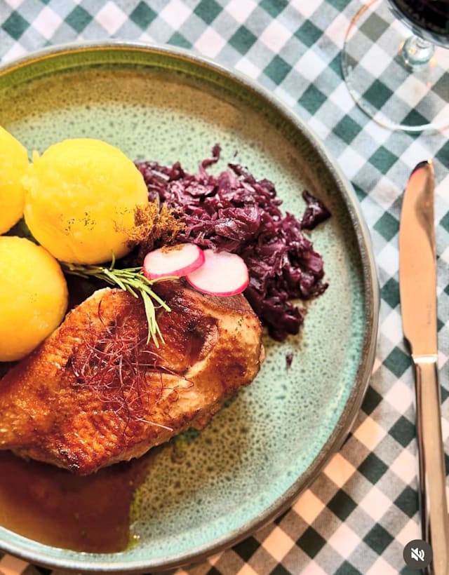 - BBQ Kirsch soße | gewürz-rotkraut | abgeschmeltzte kartoffelklöße | gewürz jus