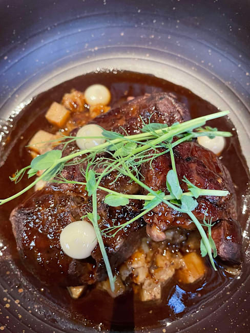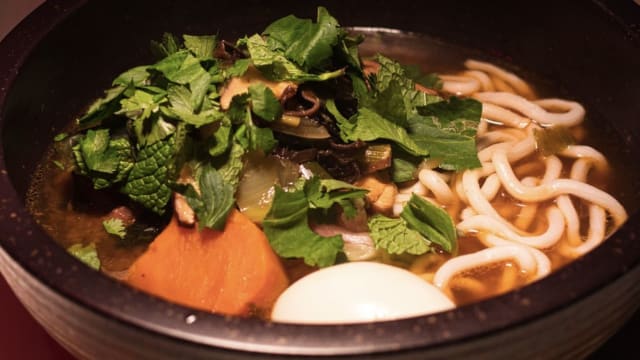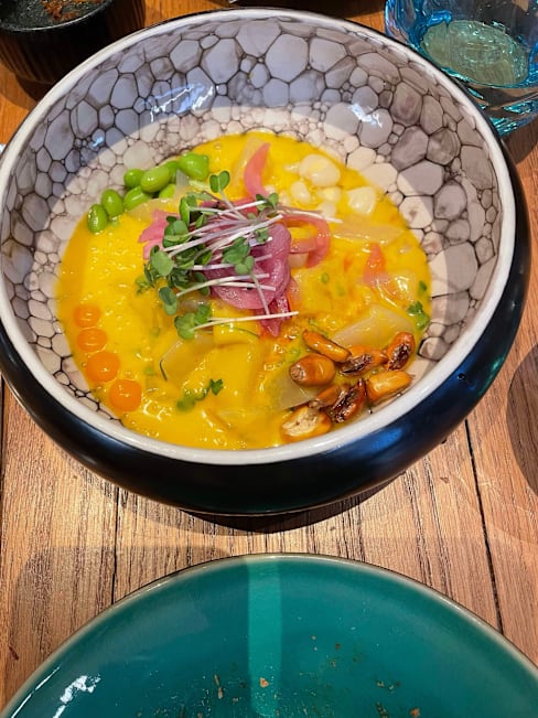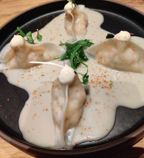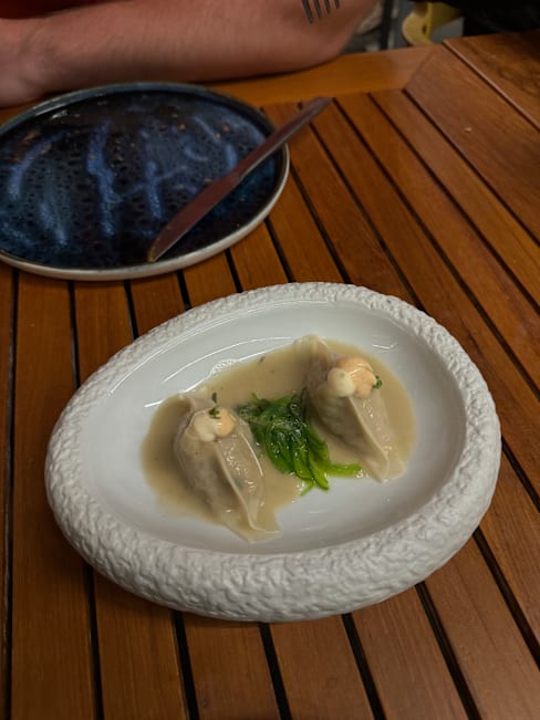 4.5/10The experience left much to be desired, particularly given the steep prices. The creativity of the menu was apparent, especially with the unconventional addition of mint and hardboiled egg to the ramen, which was also heavily laden with coriander. The lack of chopsticks for a dish that traditionally relies on them felt odd. The risotto was marred by whole pepper seeds, which were jarring to encounter and detracted from the meal. While the broth of the ramen was a redeeming feature, offering a flavorful base, it couldn't make up for the overwhelming use of coriander in nearly every dish and the prawn gyozas that were disappointingly similar. Furthermore, the service was quite poor, contributing to an overall disappointing dining experience. The quality of both food and service did not match the high cost.
