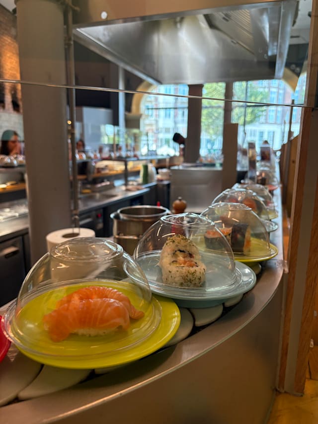 7/10average quality sushi, but one and the only sushi conveyor format in Amsterdam center, overall a nice experience.