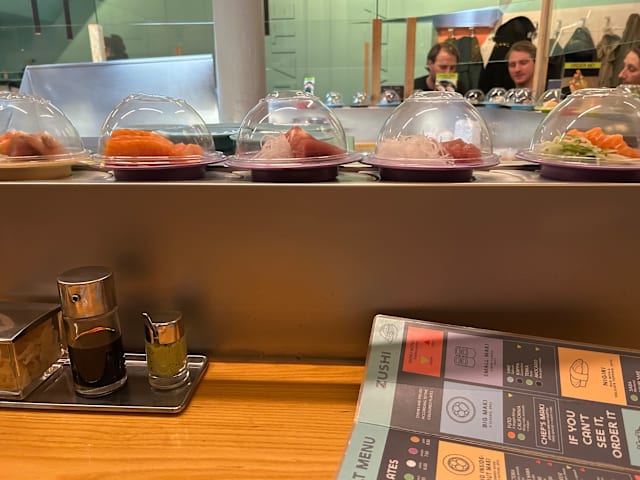 7.5/10The experience about picking up the food from a moving belt was nice. Other than the bar chairs, they have tables for groups of 4 or 6, which is also nice. However, food was nothing extraordinary. At the end of the dinner, we thought we paid too much for we had.